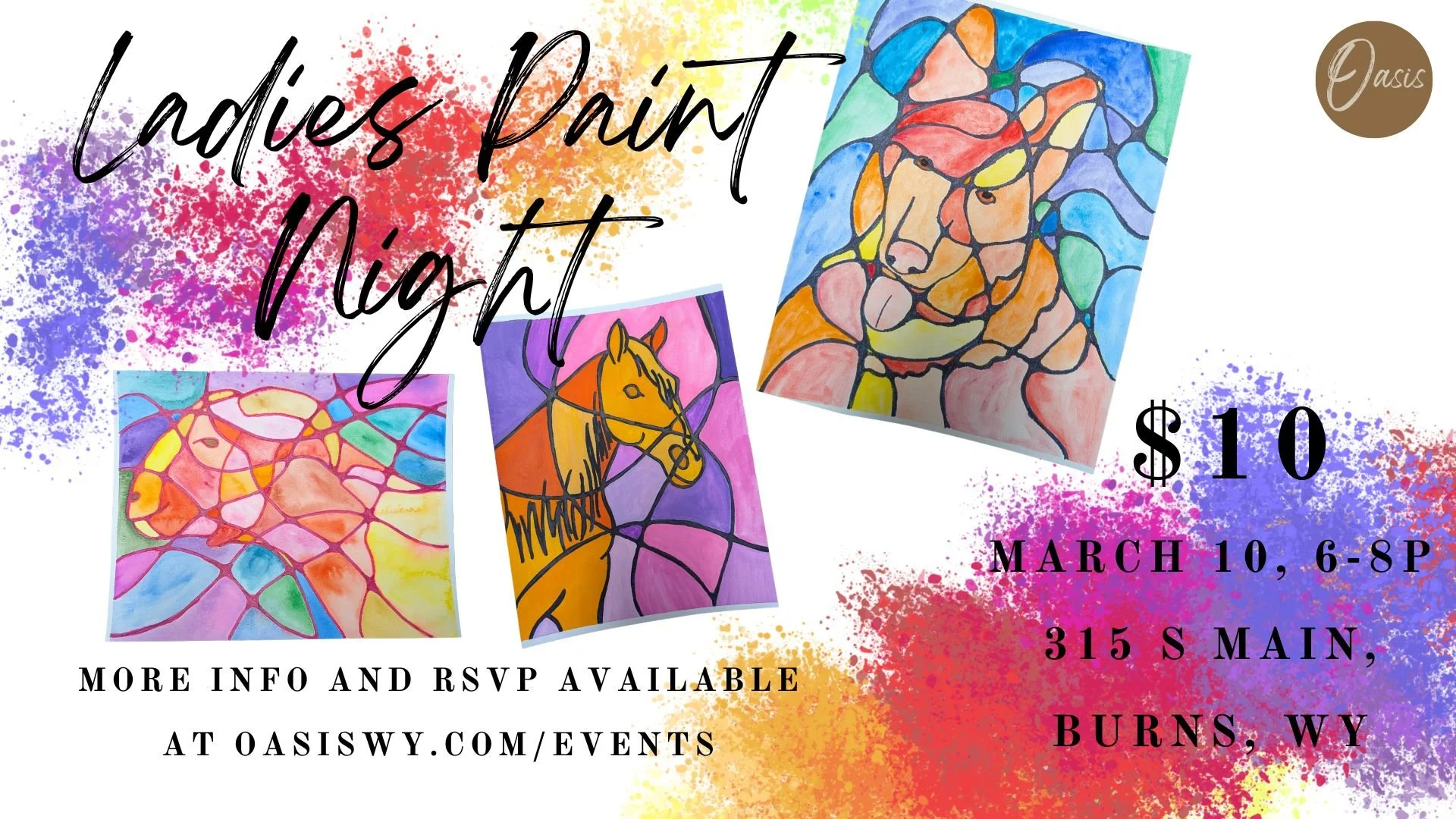 Back to All Events Ladies Paint Night Tuesday, March 10, 2026 6:00 PM 8:00 PM North Building Meeting Room 315 S Main St Burns, WY 82053 United States (map) Google Calendar ICS Join us on Tuesday March 10th at 6p for a Ladies Paint Night hosted by Oasis. We have a “paint your pet” water color painting planned, along with light snacks and a fantastic guest speaker. Sign up Now